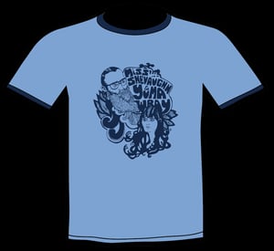 This a blue men's ringer with the "We're From Here" design in dark blue ink.